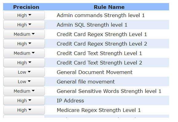 Default settings consist of predefined templates for monitoring data related to privacy regulations and security standards. The default settings can be easily extended to capture company’s IP and specific data sets.